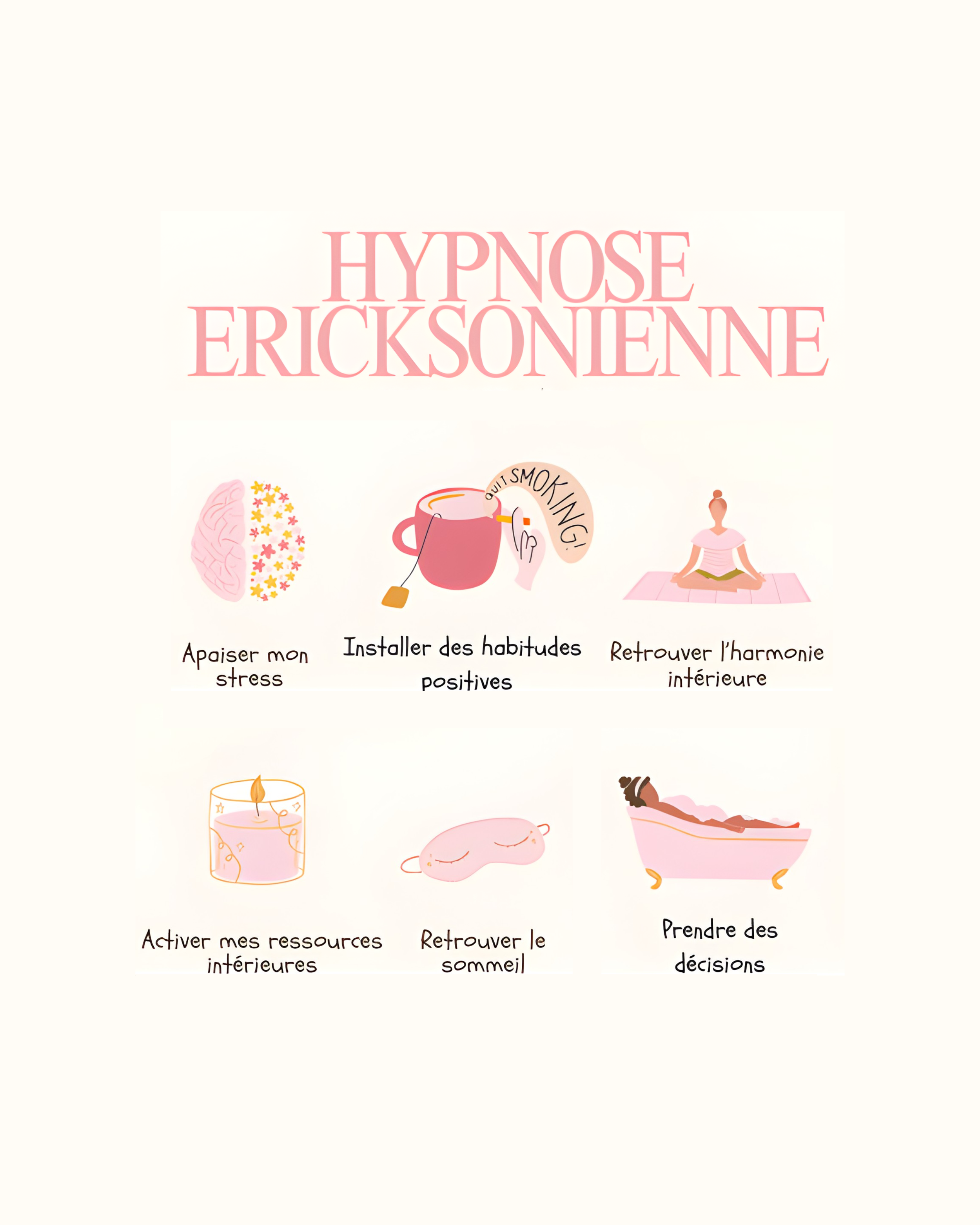 Je m’adapte au rythme de chacun, sans jamais brusquer et dans un cadre de confiance réel. En hypnose Ericksonienne, je permets à chacun d’explorer et de mobiliser ses propres ressources.